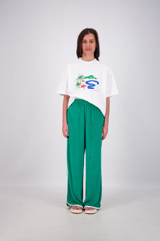 Experience comfort and style with the Kuhio Pants in Green. Crafted from soft cotton terry, these relaxed-fit pants feature an elastic waistband and two side pockets for practical wear. The contrast stripe detail and curved hem with side splits add a modern touch, while the easy-care fabric is designed to wash and wear effortlessly. Perfect for casual days when you want to look and feel your best.