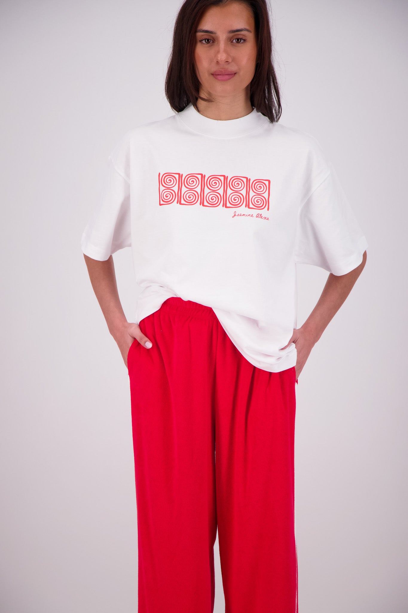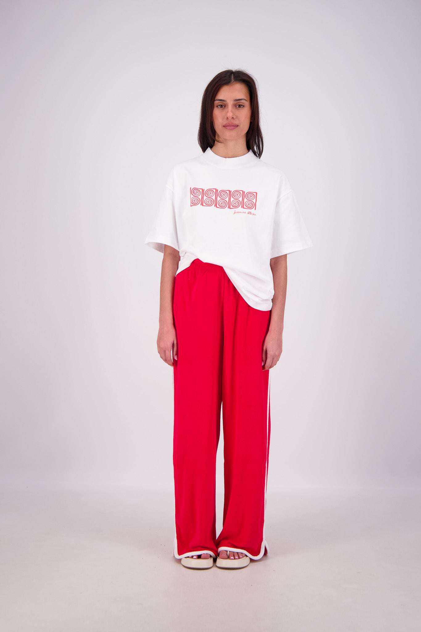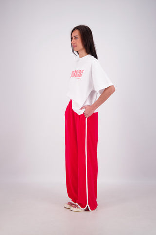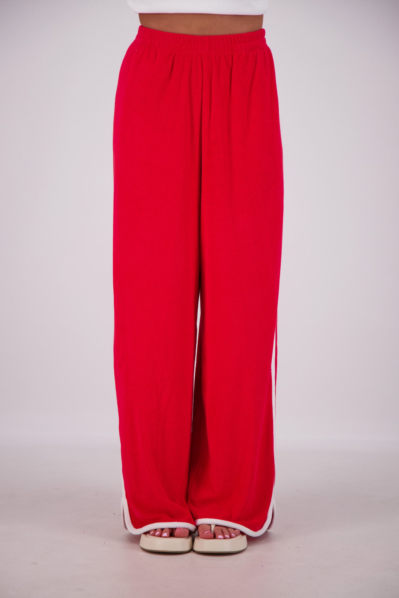 Experience comfort and style with the Kuhio Pants in Red. Crafted from soft cotton terry, these relaxed-fit pants feature an elastic waistband and two side pockets for practical wear. The contrast stripe detail and curved hem with side splits add a modern touch, while the easy-care fabric is designed to wash and wear effortlessly. Perfect for casual days when you want to look and feel your best.