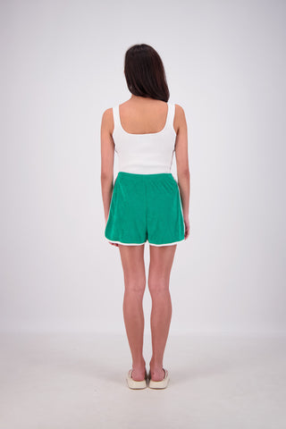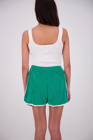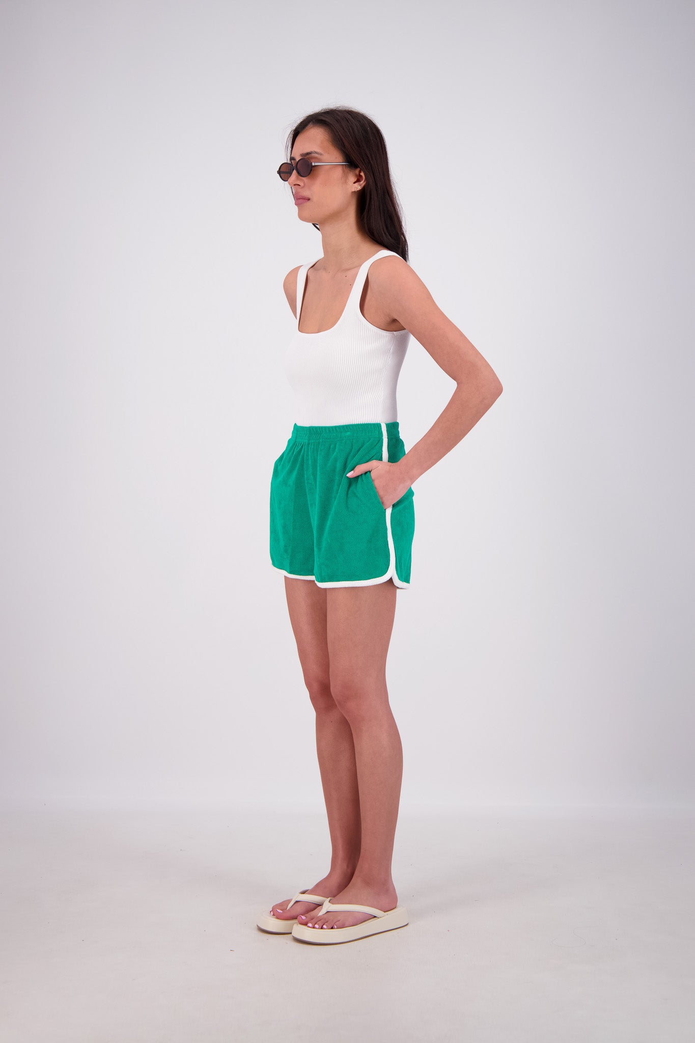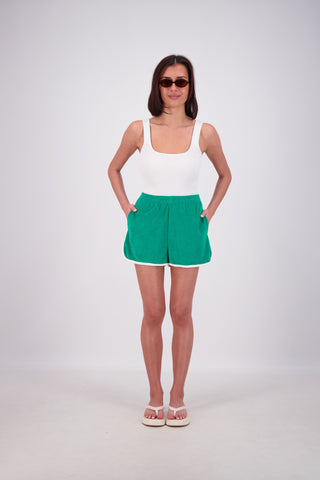 Experience all-day comfort with the Kuhio Shorts in Green, crafted from soft cotton terry for a breathable, relaxed fit. Practical and stylish, they feature two side pockets and a striking contrast stripe detail. The elastic waistband offers a perfect fit, while the curved hem with side splits adds effortless movement. Designed to withstand frequent washing without losing shape, these shorts are your go-to choice this summer for easy, stylish wear every day.
