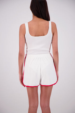 Experience all-day comfort with the Kuhio Shorts in White, crafted from soft cotton terry for a breathable, relaxed fit. Practical and stylish, they feature two side pockets and a striking contrast stripe detail. The elastic waistband offers a perfect fit, while the curved hem with side splits adds effortless movement. Designed to withstand frequent washing without losing shape, these shorts are your go-to choice this summer for easy, stylish wear every day.