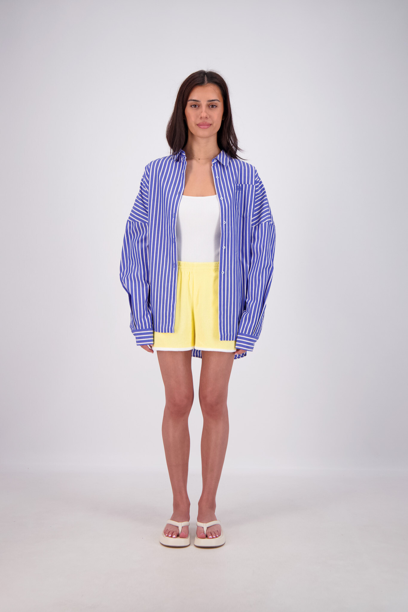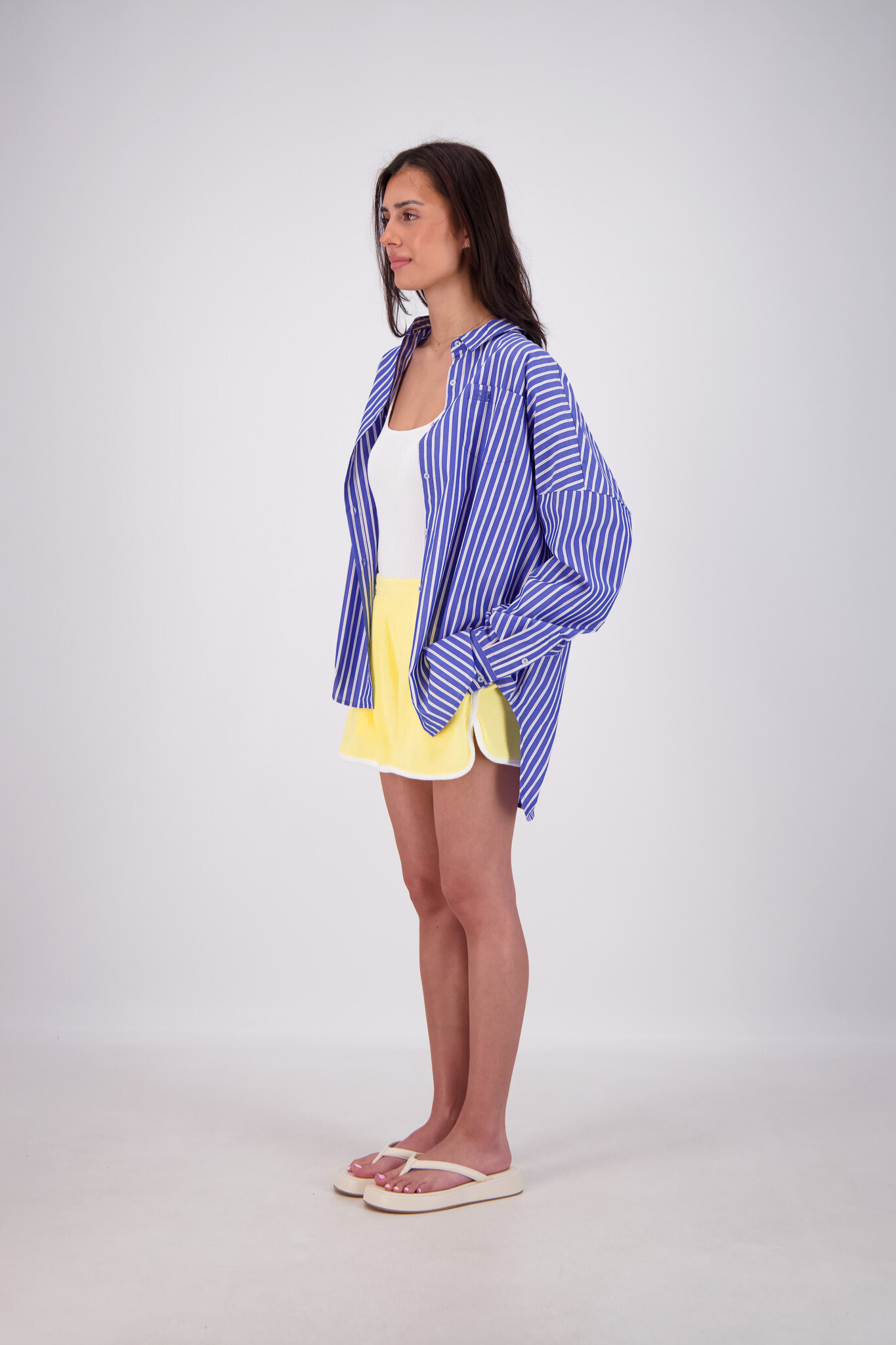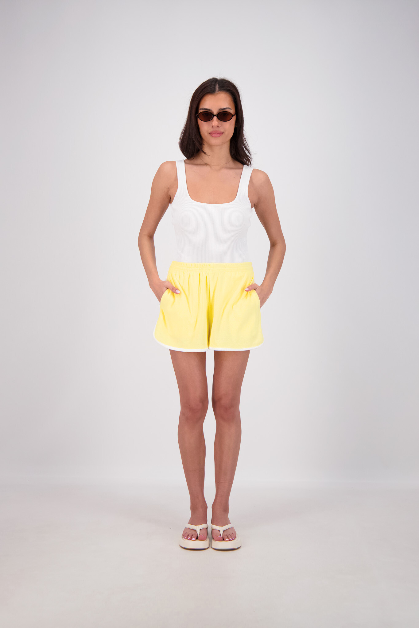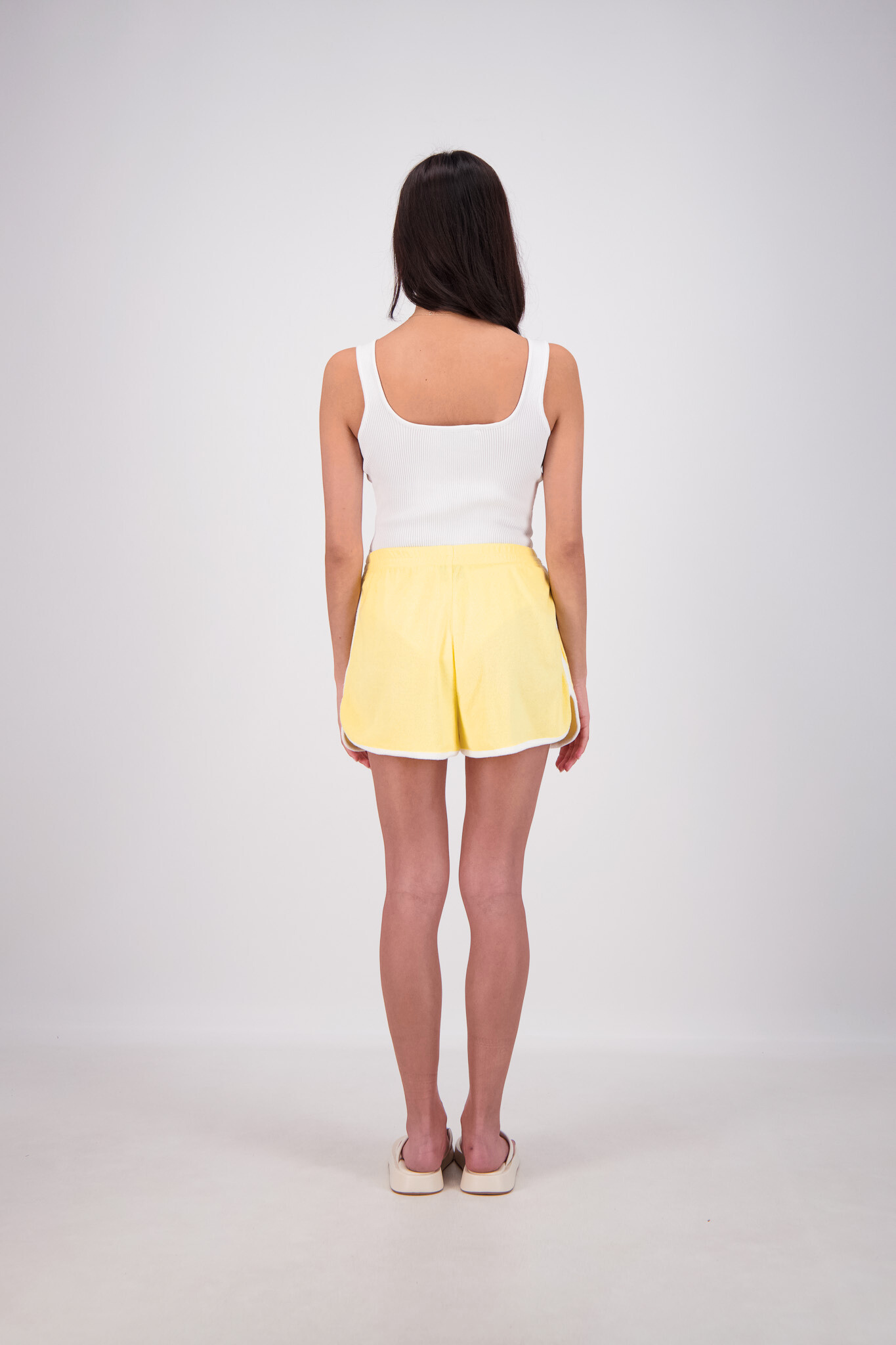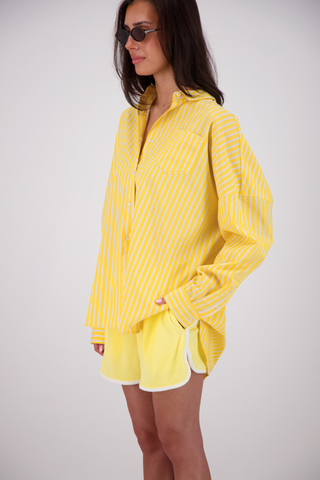 Experience all-day comfort with the Kuhio Shorts in Yellow, crafted from soft cotton terry for a breathable, relaxed fit. Practical and stylish, they feature two side pockets and a striking contrast stripe detail. The elastic waistband offers a perfect fit, while the curved hem with side splits adds effortless movement. Designed to withstand frequent washing without losing shape, these shorts are your go-to choice this summer for easy, stylish wear every day.
